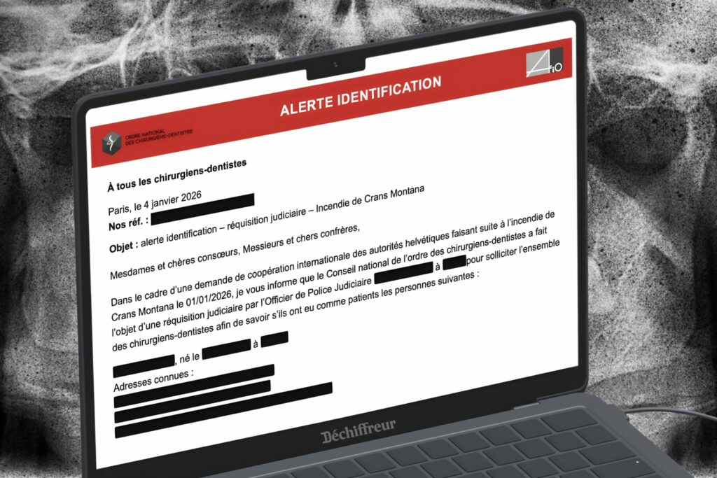 Le 4 janvier, l’ensemble des chirurgiens-dentistes a reçu un courriel émanant du président du Conseil national de l’Ordre des chirugiens-dentistes, que Déchiffreur a pu consulter. Dans ce message, le président informe ses confrères que « dans le cadre d’une demande de coopération internationale des autorités helvétiques faisant suite à l‘incendie de Crans-Montana le 1er janvier 2026, et du déclenchement d’une procédure d’identification, le Conseil national de l’ordre des chirurgiens-dentistes vient de faire l’objet d’une réquisition judiciaire par l’Officier de Police Judiciaire […] pour solliciter l’ensemble des chirurgiens-dentistes », écrit-il. Le message précise ensuite l’identité des personnes recherchées : nom, prénom, date de naissance, ainsi que leurs dernières adresses postales connues. Dans le cas précis de l’incendie du Bar Le Constellation à Crans-Montana, ce sont trois personnes qui font l’objet d’une recherche d’identification odontalgique. Le président de l’Ordre conclut en invitant les praticiens susceptibles de détenir des informations à se manifester directement auprès du Service national de police scientifique, de l’Unité d’identification des victimes de catastrophes (UPIVC), ainsi que de l’officier de police judiciaire en charge de la procédure.